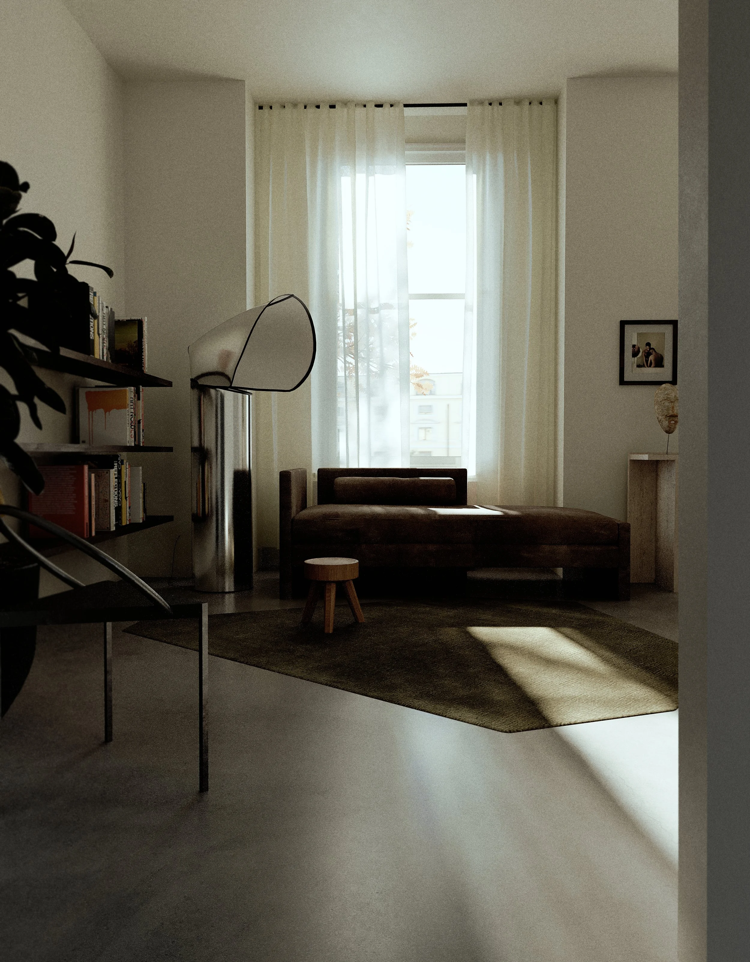 TRNK Spring Campaign Scene - Featuring TRNK Segment Chaise, Poly rug, Flos Chiara floor lamp, Frama AML stool and Triangolo chair.
